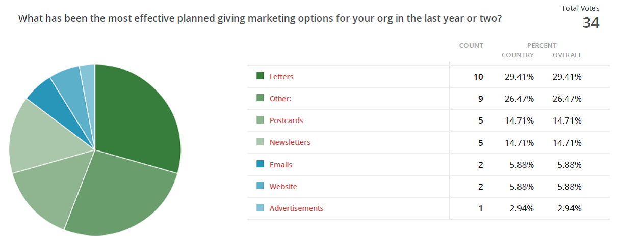 Interesting that letters won the poll – I was just editing one of the my upcoming sessions for the Planned Giving Boot Camp a few minute ago and I said that I hated letters! The “other” answers addressed personal visits, professional advisors, events, and other various things orgs do in planned giving.