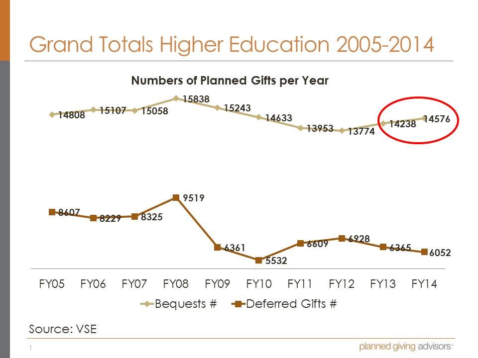 This first slide, which is just one of many we are preparing for an upcoming webinar, shows that planned giving dollars to higher education is on the upswing. That fact isn’t so momentous but it is interesting to note that FY14 planned giving numbers were the best ever for the University world in terms of total gross dollars received from planned gifts (bequests and deferred gifts present valued) in any year since 2005 and probably forever (VSE #s before 2005 are not available).