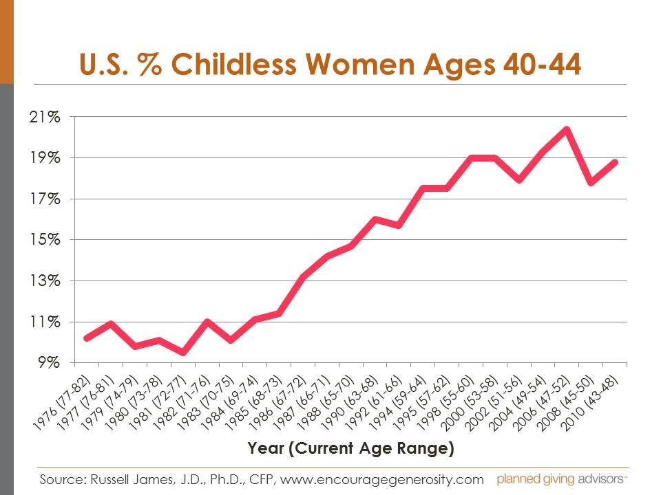 Get the message? The numbers of women in their 60s is already much greater than the pre-boomer population in their 70s. But, add in this factor of childlessness among this group, it seems incredibly obvious that nonprofits need to adjust and of course, invest in their planned giving programs!