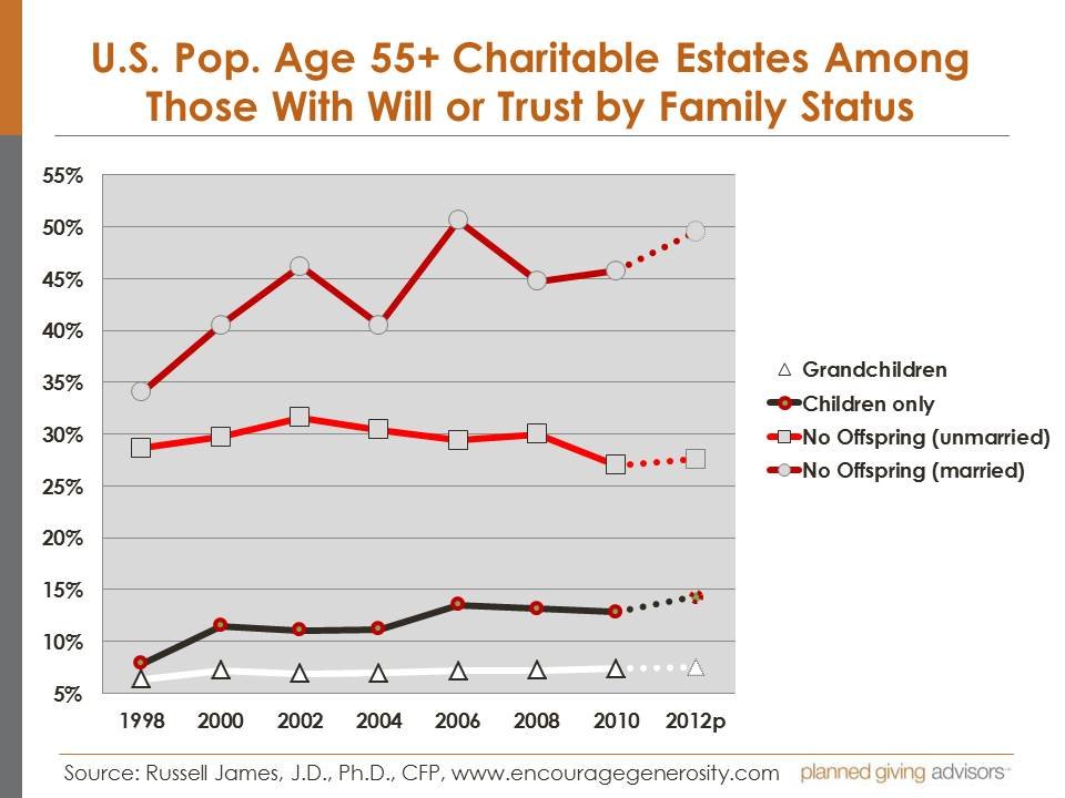 The conclusion is clear from the slide: childlessness is a huge factor for inclusion of charity in estate plans.