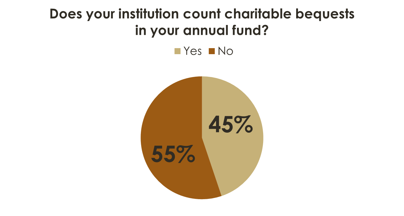 I am actually surprised at this result. I just assumed everyone, or almost everyone, includes realized  bequests in their annual fundraising totals.  Maybe the question was confusing as I should have asked “whether your org includes realized bequests in  your annual fundraising totals?”